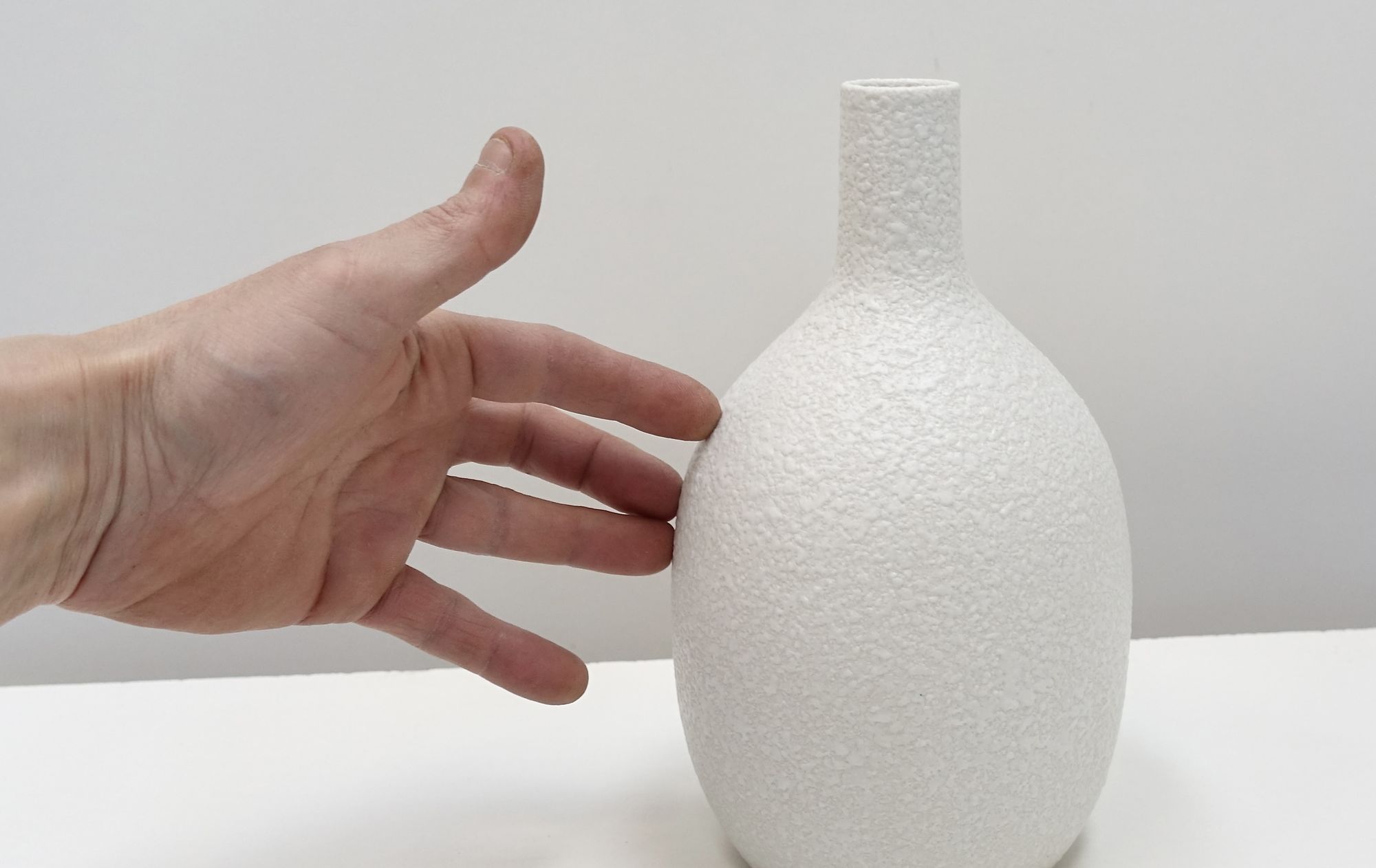 Minimalist porcelain vase with white “crisp” glaze, German production, with engraved model numbering or 1976 date. Workshop stamp. Vase in perfect condition.