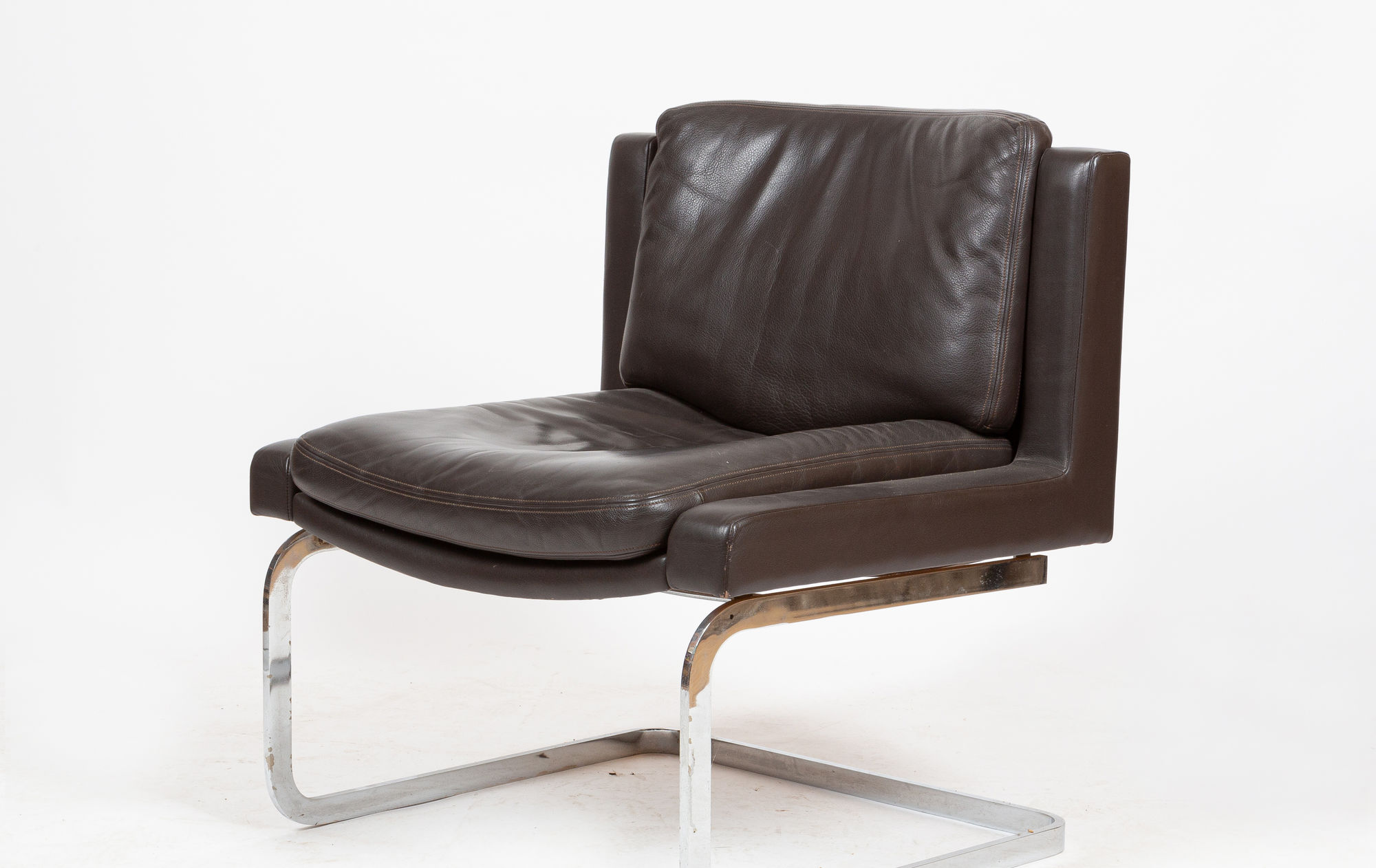 Set of two RH 201 Executive Lounge Chairs designed by Robert Haussmann for De Sede in the 1960s. Very heavy, sturdy and comfortable, flat profile steel legs and leather upholstered frame with two brown leather cushions.