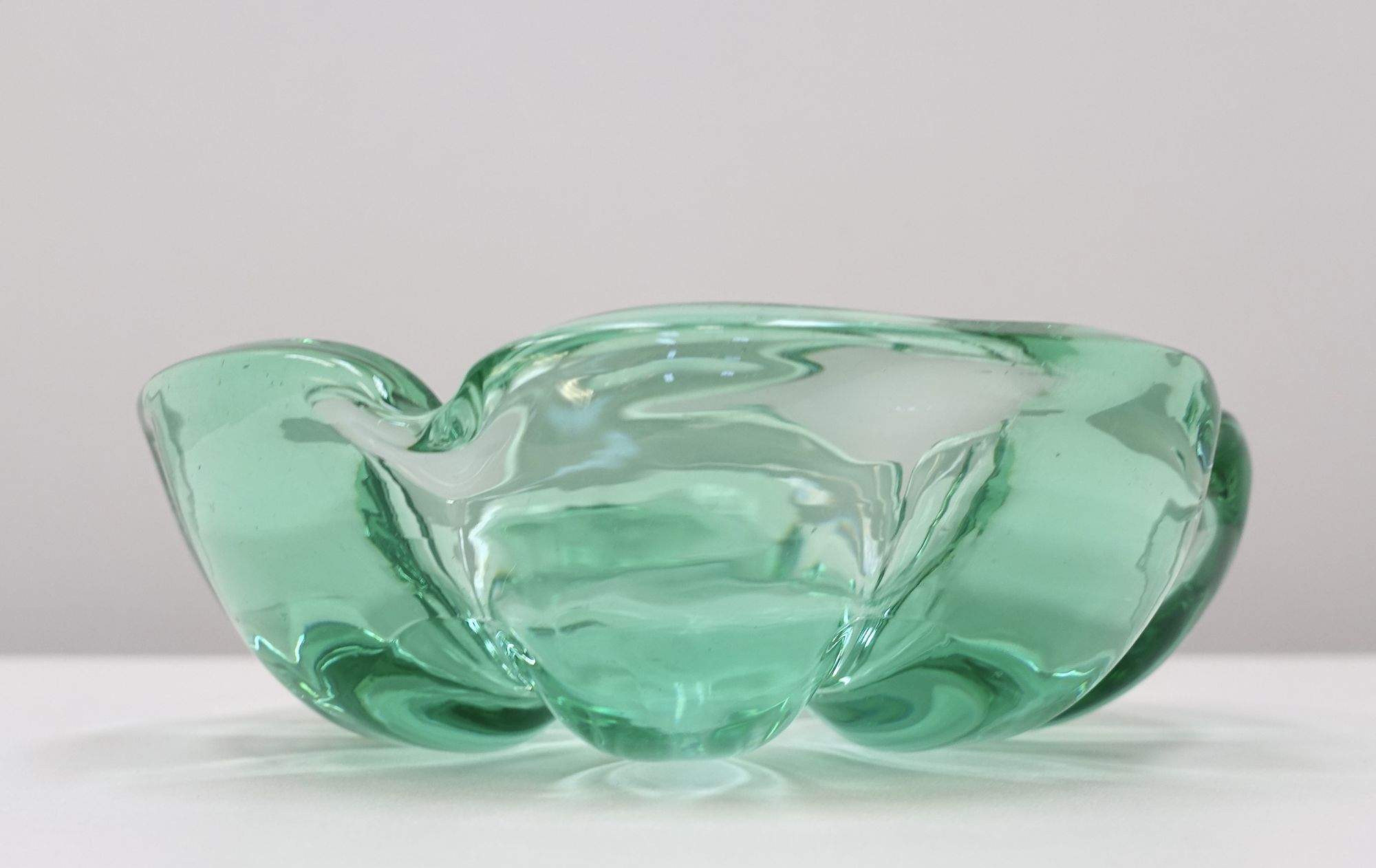 Lovely slightly green glass bowl, blown and hot-molded with tongs. Certainly Murano production from the '50s-'60s in very good condition.