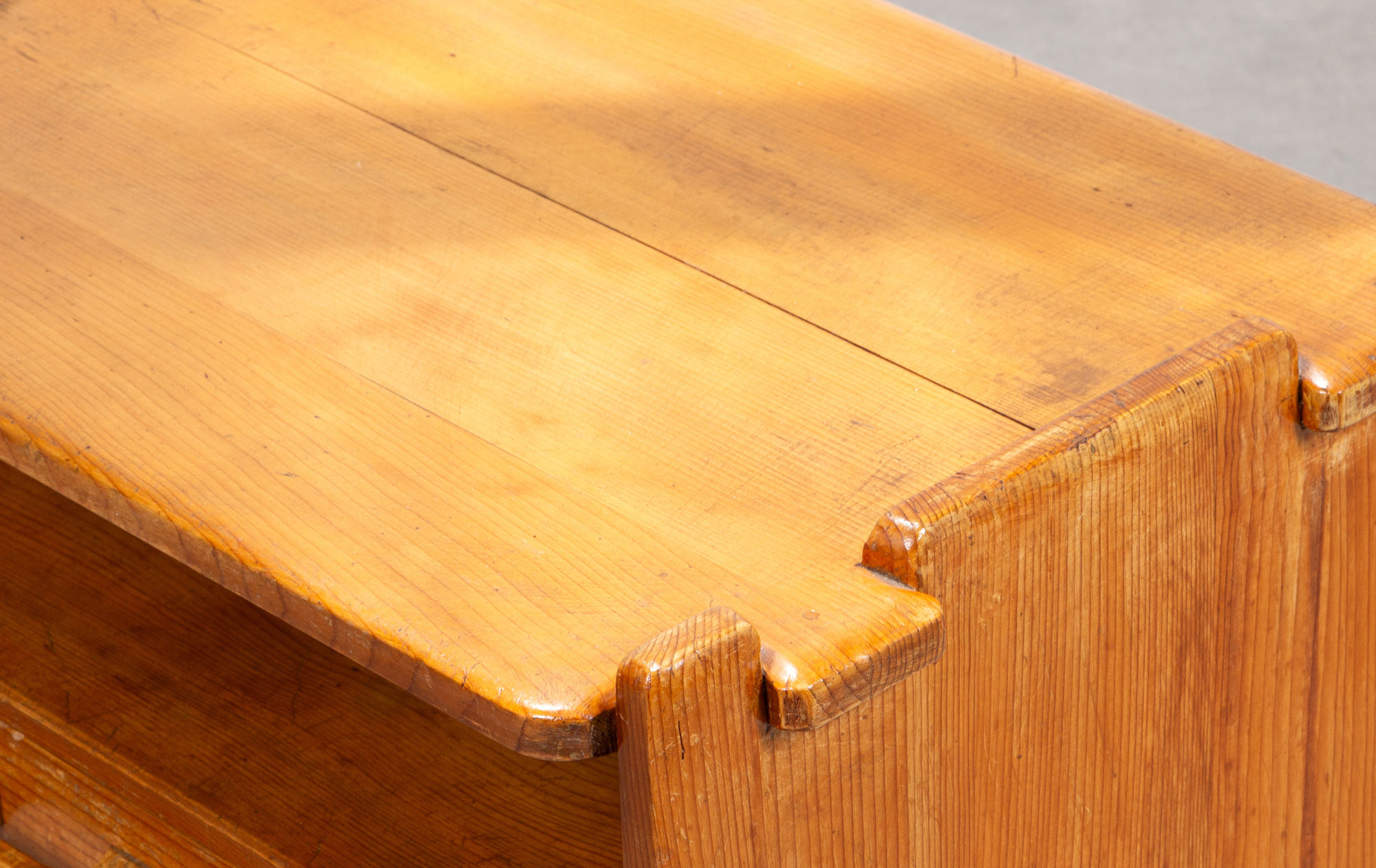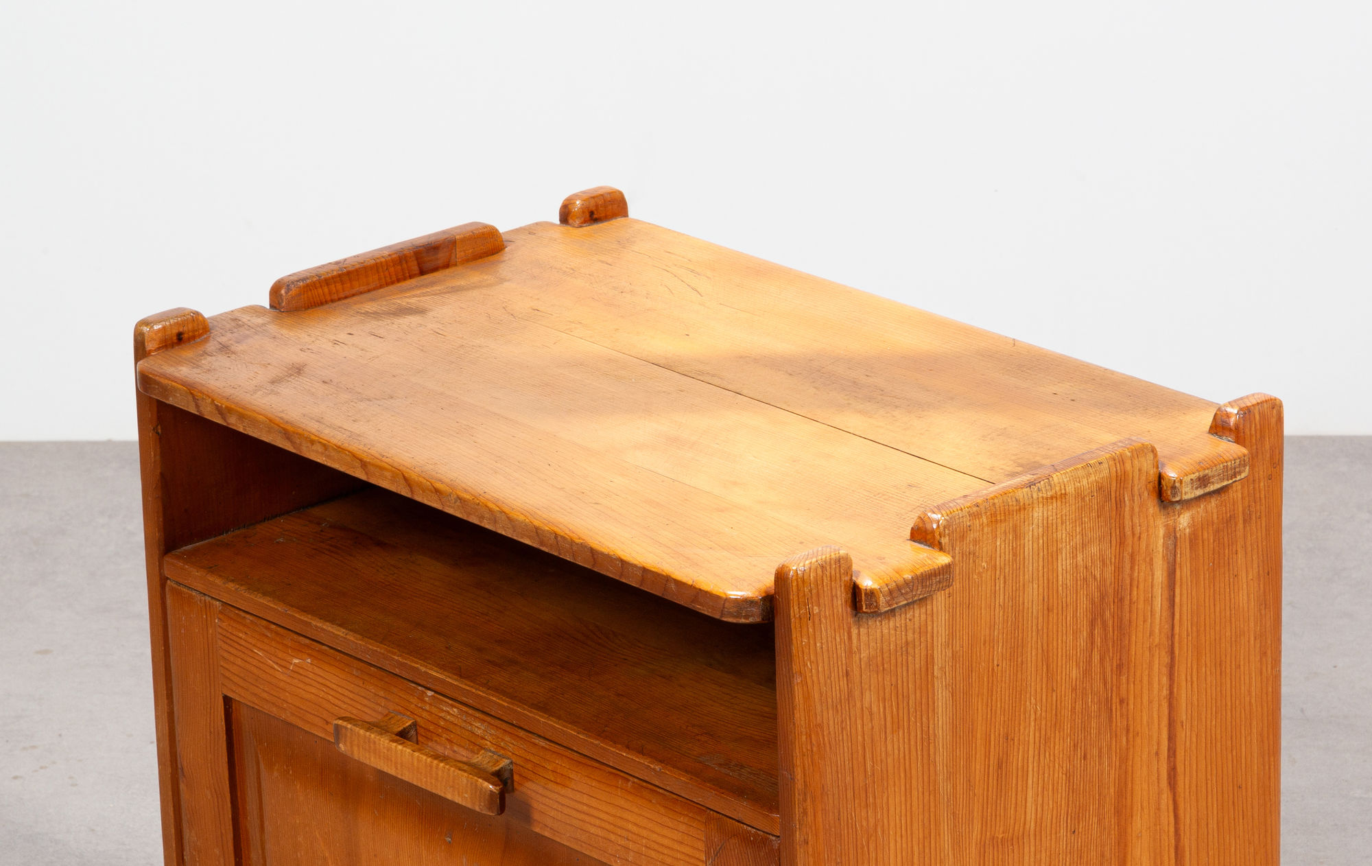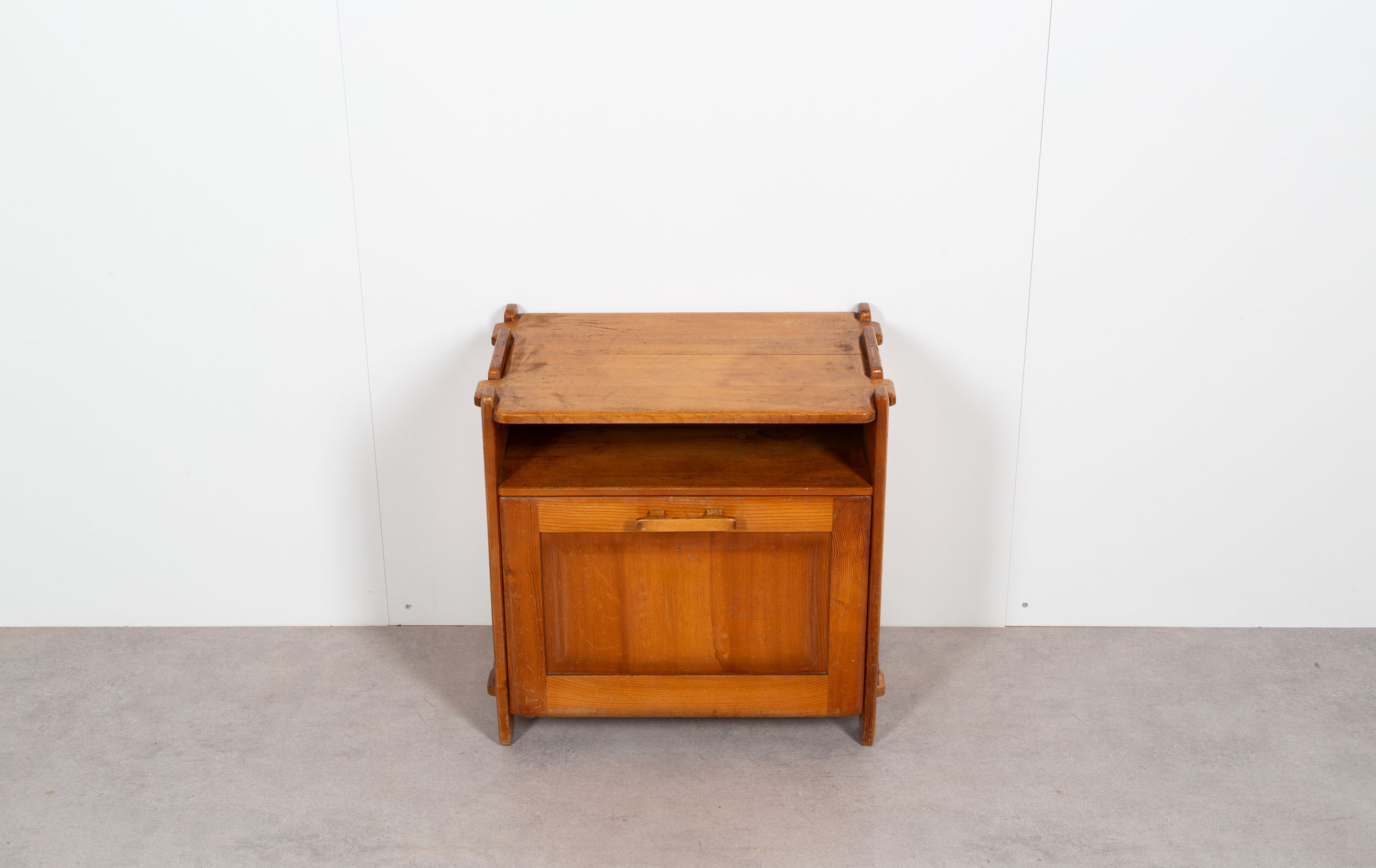 Small solid fir sideboard attributed to Franz Xaver Sproll. Flap door, visible eagle-tail joints. Good original condition with traces of use, circa 1955-60.
