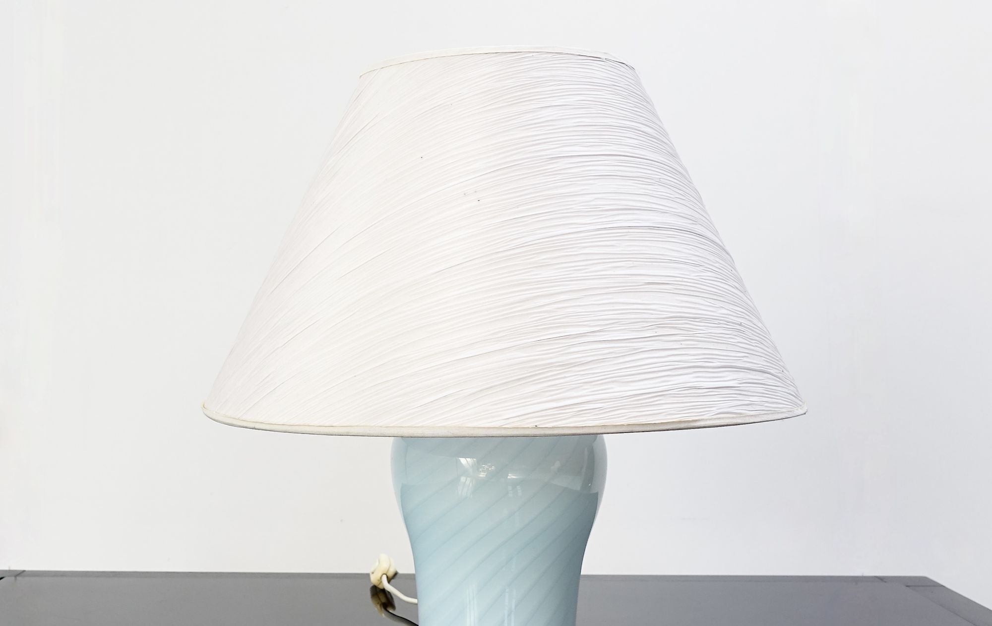 Blown glass lamp, certainly of Italian Murano production, circa 1970. Original crumpled paper shade. Sold with or without shade. Good condition with slight traces of use.